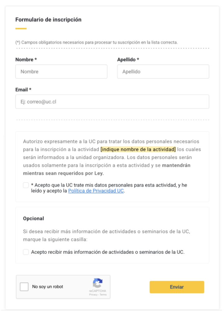"Autorizo expresamente a la UC para tratar los datos personales necesarios para la inscripción a la actividad [indique nombre de la actividad] los cuales serán informados a la unidad organizadora. Los datos personales serán usados solamente para la inscripción a esta actividad y se mantendrán mientras sean requeridos por Ley".